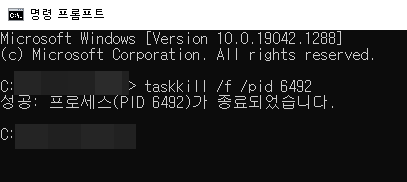 3. 80포트를 확인하고 옆에 PID를 아래의 명령어에 입력, taskkill /f /pid 6492 입력